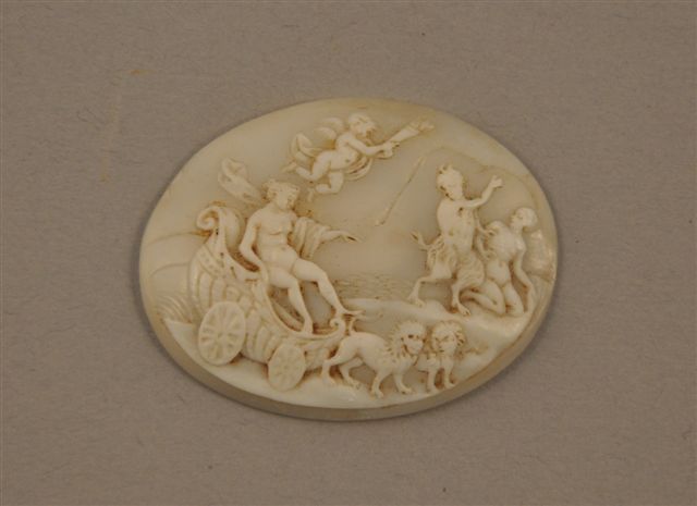 CAMÉE. Scène mythologique représentant une déesse dans un char tiré par deux lions, une victoire ailée l'annonçant, précédée par un faune et une jeune femme. 2 x 3,5 cm.