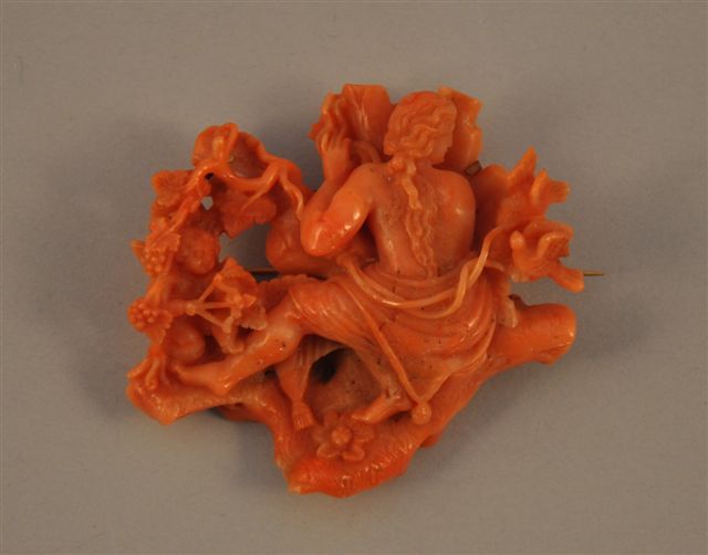 GROUPE en CORAIL sculpté en haut relief représentant Vénus en cupidon à son arc. Monture en or formant broche. XIXème. Haut. 6, Long. 7 cm. (petits accidents et manques)
