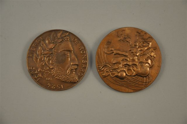 Joint : MEDAILLE en bronze patiné "Pierre de Ronsard (1524-1585)". "Pren ceste rose aimable comme toy". Datée 1980 sur la tranche. Diam. 68 mm