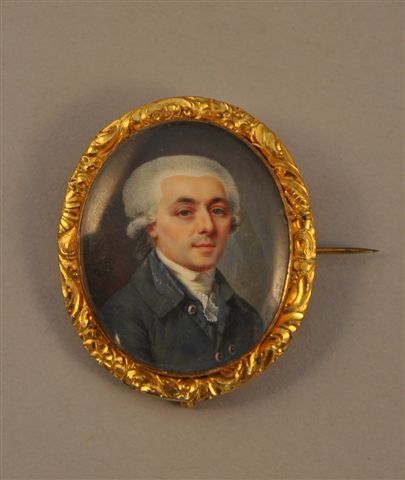 Miniature ovale représentant un portrait d'homme de trois quart, signé et daté SICARDI, 1785, au centre à gauche. Entourage en métal doré et ciselé, monté en broche, verre bombé.