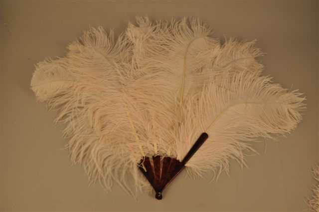 PAIRE d'ÉVENTAILS, monture en composition à l'imitation de l'écaille appliqué de plumes d'autruches teintées rose pâle. Chacun signé DUVELLEROY. Haut. 50, Larg. déployée : 50 cm environ chaque. D'après la tradition familiale : parure pour le bal des petits lits blancs.