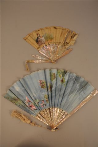 DEUX ÉVENTAILS à monture en nacre unie. Le premier, à panaches droits, flèches en os repercées de motifs floraux stylisés, feuille en tissu bleu peint à la gouache d'un branche de pélargonium en fleur sur fond de paysage de forêt, signé A. Delambre. Gland de passementerie en soie crème, bélière en métal et rivure ornée de pierres blanches taillées. Haut. 30, Larg. déployé : 57 cm. (accident et manque à un brin, un panache accidenté).