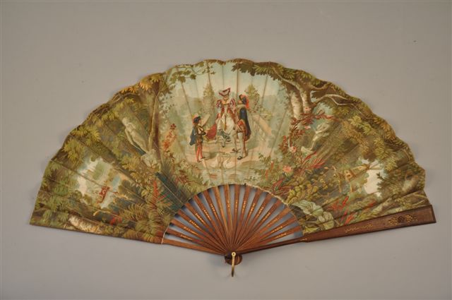 ÉVENTAIL plié à monture en bois à décor incisé et doré de motifs stylisés, feuille en toile chromolithographiée sur une face, représentant une jeune femme descendant l'escalier d'un parc, aidée de serviteurs, dans un entourage de verdure, scènes animées latéralement, rivure en laiton et os. Haut. 34,5, Larg. déployé : 66 cm.
