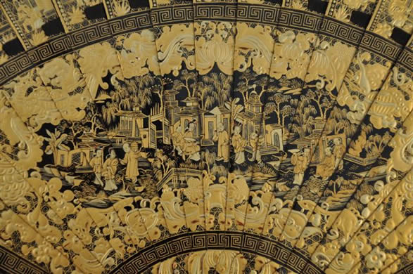 ÉVENTAIL brisé en laque brun à 19 brins, riche et fin décor en laque or de deux tons en relief, sur les deux faces, de scènes de cour, dans un entourage peuplé d'animaux et de motifs stylisés, encadrement de frise de grecques. Japon, XIXème. Haut. 20, Larg. déployé : 34 cm. Ecrin habillé de tissu bleu à motifs.