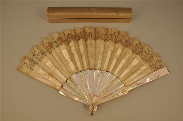 ÉVENTAIL plié, la monture en nacre unie, la feuille en satin de soie crème appliquée de dentelle, extrémité des flèches en os repercé de motifs géométriques, bélière en laiton, rivure ornée de pierres blanches taillées. Dans un écrin habillé de satin de soie crème, marqué de A. RODIEN, éventailliste, 48, rue Cambon, ancienne rue de Luxembourg. XIXème. Haut. 30, Larg. déployé : 54 cm.