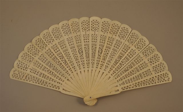 ÉVENTAIL brisé en os, largement ajouré de motifs stylisés géométriques sur plusieurs registres.