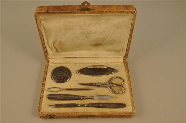 NÉCESSAIRE DE MANUCURE en argent à décor de rubans et de fleurettes. Dans un coffret.