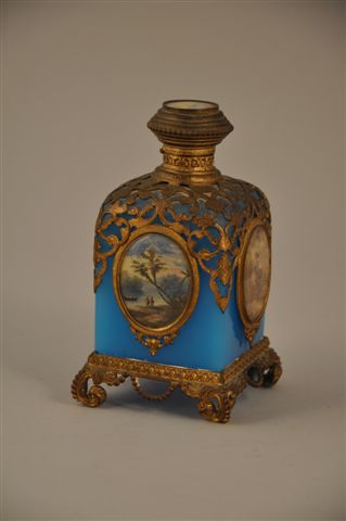 FLACON à parfum de forme quadrangulaire en opaline de couleur bleu. Monture en laiton doré composée d'une base à frise de raies de coeurs et rangs de perles reposant sur quatre pieds en volute feuillagée, et d'une résille ajourée, couvrant l'épaulement, à motifs de rinceaux gravés, présentant des médaillons ovales et rond en fixés sous verre sur les quatres face du corps et sur le bouchon à charnière, représentant des scènes de port ou champêtres, animées de personnages. XIXème. Haut. 13,5 cm.