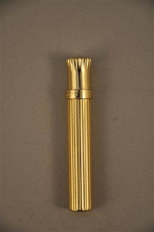 FLACON DE PARFUM en métal doré, de forme oblongue, le corps rudenté, le bouchon à vis. Marqué F. Millot. France début XXème. Haut. 8, Diam. 1,5 cm.