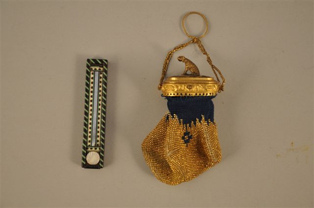 LOT comprenant une BOURSE en maille de couleur bleu et perles de métal, monture en laiton doré, avec couvercle surmonté d'un chien. Vers 1850.