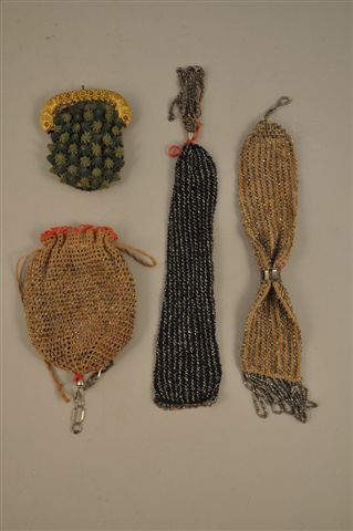LOT comprenant QUATRE BOURSES. La première à motifs de chapeaux juxtaposés, confectionnés en fil vert de deux tons, la monture en laiton doré à décor en repoussé d'un rang de fleurs et de feuilles d'acanthe latéralement. Restauration. XIXème. Larg. 8 cm.