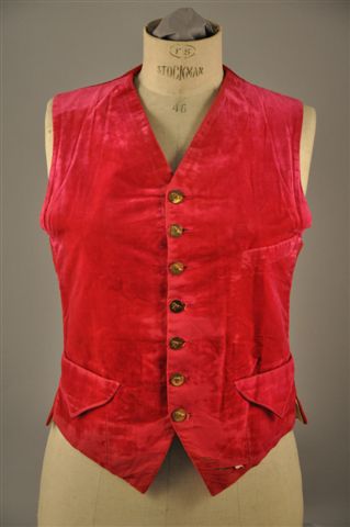 GILET d'homme en velours rouge framboise, à sept boutons en laiton doré à motif de tête de cervidé, deux fausses poches à rabats triangulaires. Haut. 62 cm (usures)