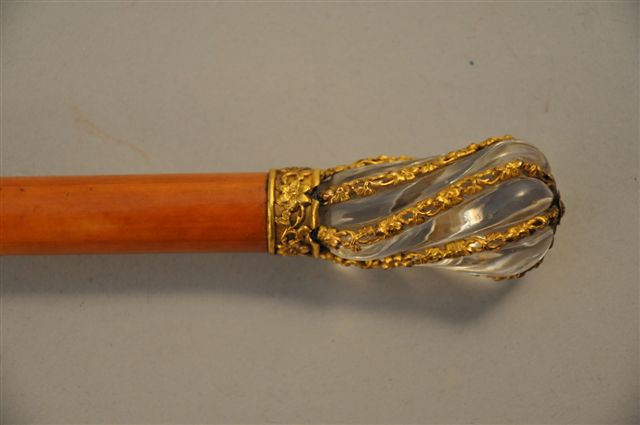 PARAPLUIE le pommeau en cristal godronné sur une monture de guirlande de fleurs en métal doré, le mât monogrammé surmonté d'une couronne ducale, toile imperméable à carreaux. Travail de qualité de la maison Bétaille, 20 rue Palais Royale. Long. 97 cm. (petit éclat au cristal)