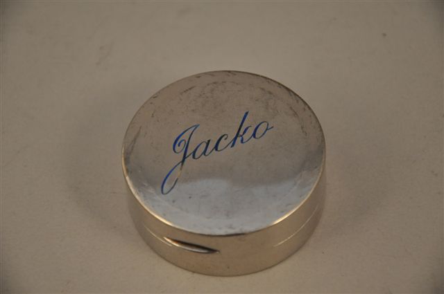 BOÎTE ronde en argent gravé et émaillé bleu "Jacko". Poinçon anglais. Londres, 1919. Poids : 55 g. (petit manque à l'émail)