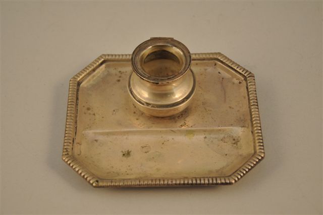 ENCRIER en argent de forme octogonale, le pourtour du plateau godronné reposant sur quatre pieds boules, le porte godet en forme de vase et le godet en verre. Haut. 4,5, Long. 12, Prof. 10,5 cm. Poids : 125 g. (manque le couvercle du porte godet).