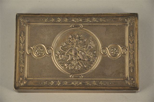 BOÎTE à TIMBRE rectangulaire en argent. Décor de fleurettes et de palmettes dans l'encadrement, au centre un trophée avec deux colombes, un arc et un carquois. Trois compartiments à l'intérieur. Orfèvre Bointaburet à Paris. Milieu XIXème. Poinçons Minerve. Poids : 190 g.