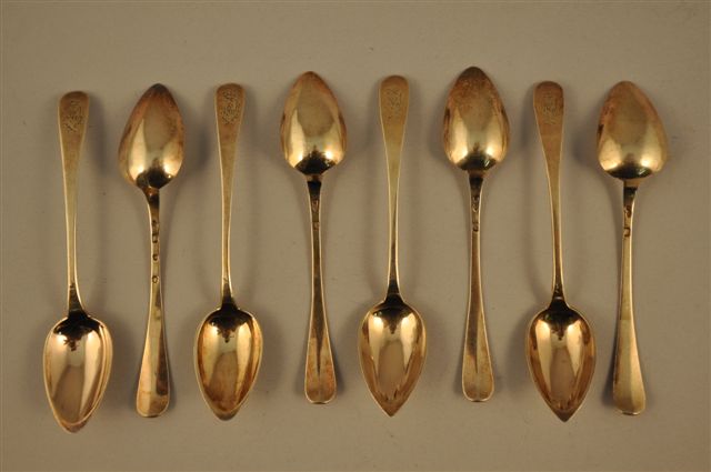 Suite de HUIT CUILLÈRES à CAFÉ en argent doré, tige de forme baguette, monogrammé RB dans un écusson avec couronne de lauriers. Poinçon Vieillard (1819-1838). XIXème. Poids : 110 g.