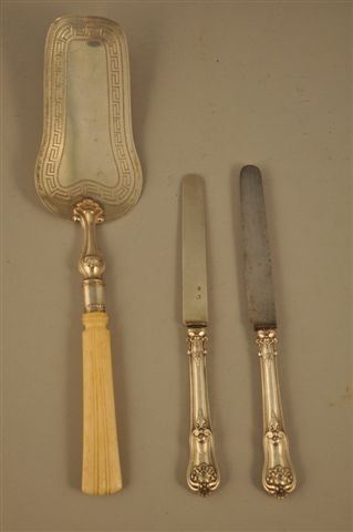 LOT comprenant une PELLE à TARTE à spatule en argent gravée d'une frise de grecques en tre deux rangs de perles, attache en palmette, manche en os. Poids brut : 60 g. AC. DEUX COUTEAUX à dessert, manches violonnés en argent fourré à palmette, l'un à lame en argent. Poinçon Minerve. Napoléon III.