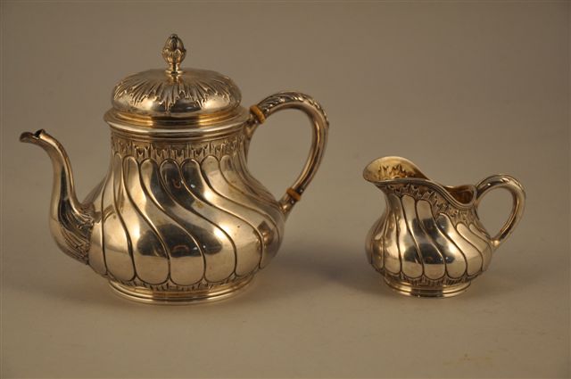 Partie de SERVICE à THÉ en argent comprenant une théière et un pot à lait, sur talon. Décor en repoussé de côtes plates torses et frises de vagues stylisées, prise du couvercle en bouton, anse feuillagée. Poinçon Minerve. Poids : 430 g.