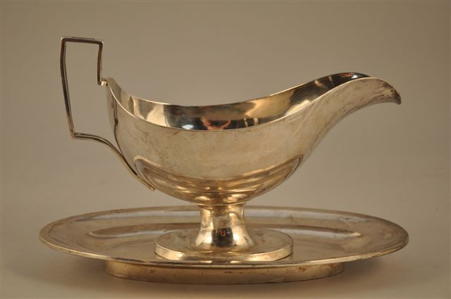 SAUCIERE et DORMANT ovale en argent uni. La saucière sur pied, l'anse droite à la Grecque. Poinçon Vieillard (1819-1838). Poids : 385 g. (choc au pied)