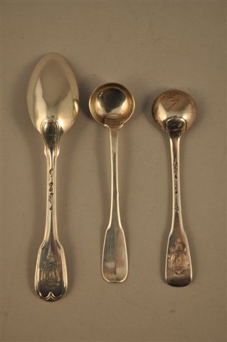 LOT comprenant une CUILLÈRE à café en argent, modèle à filets, et PAIRE de CUILLERES à MOUTARDE, modèle uniplat. Tige gravée du monogramme L.A.C., dans un cartouche ovale, surmonté d'une couronne de Baron. Maître-Orfèvre : J.A.F. Province. XVIIIème. Poids de la cuillère : 29 g. Poids des cuillères : 29 g. (accident à un cuilleron)
