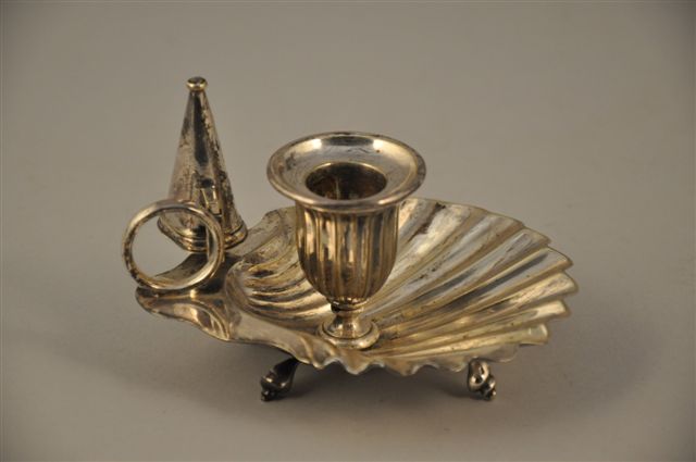 BOUGEOIR à MAIN en métal argenté, prise circulaire où s'encastre un éteignoir conique, le binet en forme de vase cannelé fixé dans une coquille, quatre pieds coquillage. Haut. 8,5, Larg. 12 cm (chocs à l'éteignoir).