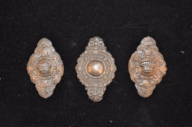 TROIS GARNITURES en plomb argenté. Dont une paire à couronne comtale en relief, dans un entourage feuillagé à disposition en éventail. Gravé et ciselé. XIXème. 9,5 x 6 cm et 10 x 6,5 cm.