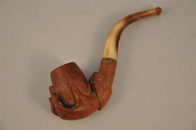 PIPE en bruyère sculptée, une main retenant le fourneau ovoïde, conduit en corne, bague métal doré à décor floral. Maison GF.