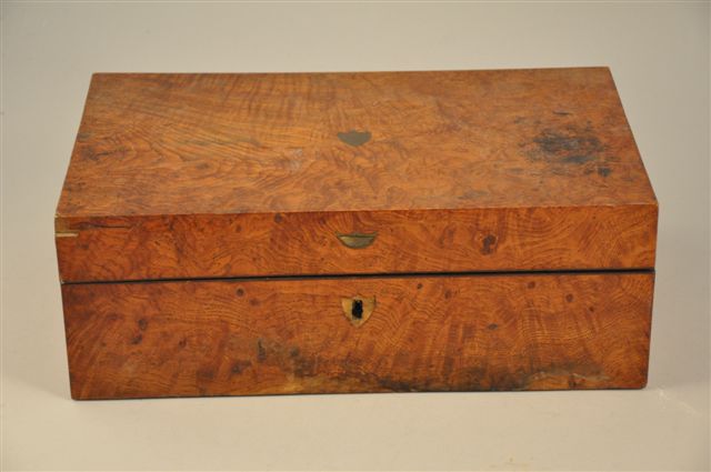 COFFRET rectangulaire en placage de loupe d'orme. Ecusson en laiton incrusté. XIXème. Haut. 13, Long. 38, Larg. 22,5 cm (accident et manques).