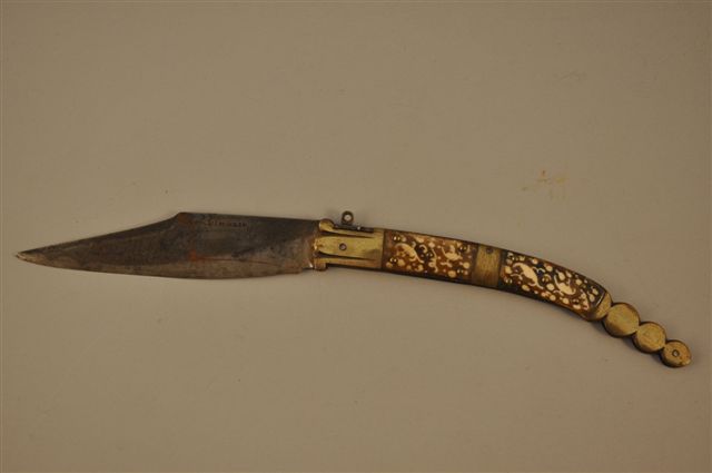 GRAND COUTEAU pliant, le manche en laiton et incrustations de nacre, la lame marquée "navaja de Toledo". Long. 34,5 cm. (oxydation à la lame)