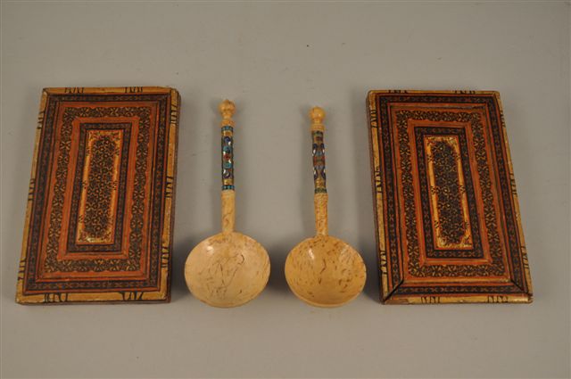 PAIRE de CUILLERES en bois exotique, le manche habillé de laiton doré présentant deux encadrements à motifs centré d'une fleur et de quatre volutes, en émail polychrome. Long. 18,5 cm.