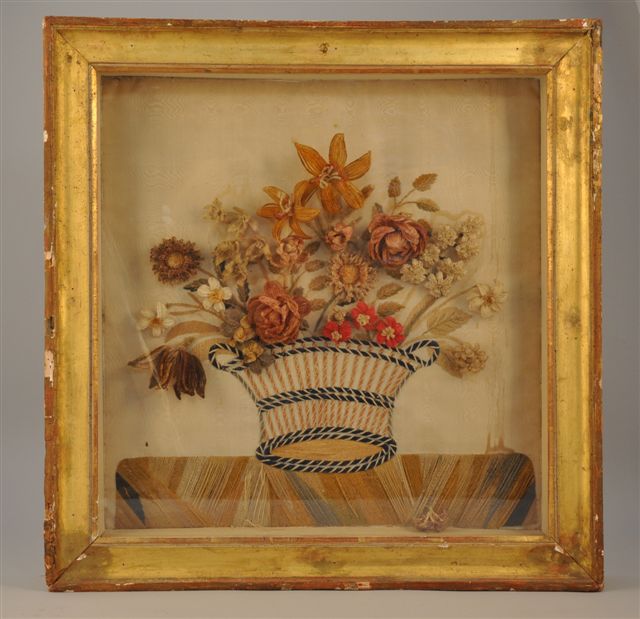 COMPOSITION brodée représentant un panier de fleurs. Broderie en fil velours sur tissu crème moiré d'un panier sur un entablement, appliqué de fleurs en relief dont lys, marguerites, orchidées...Caisse à cadre en bois doré. Milieu XIXème. Dim. hors tout : 58 x 58 cm.