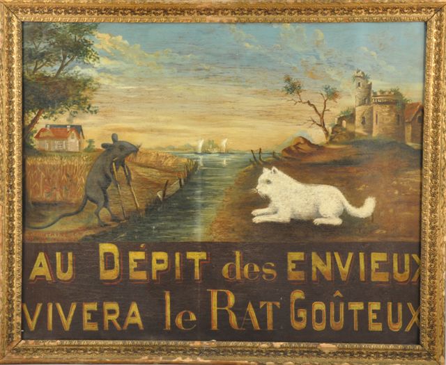 PLAQUE PUBLICITAIRE en zinc peinte représentant un rat et un chat dans un paysage fluvial et marquée " au dépit des envieux vivera le rat goûteux". Signée et datée au centre à gauche T. Fontaine, 1870. 25. janvier.