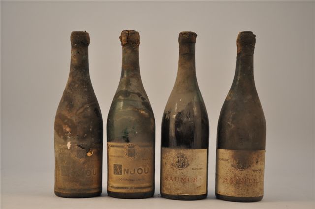 LOT de 4 bouteilles comprenant : ANJOU, Coteaux du Layon, "les Chaumines",1929, goulot ciré : 2 bouteilles (1 niveau bas et une vidange). SAUMUR, Clos les Treilles, réserve 1929 : 2 bouteilles (niveau bas)