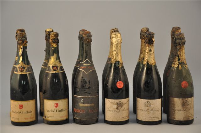 LOT de 12 bouteilles de VINS MOUSSEUX comprenant : ANDRÉ GALLOIS, vieux : 4 bouteilles (1 niveau bas, 3 vidange). BLANCHE MOUSSE, vieux : 2 bouteilles (vidange). GEORGES DE ROBERTY, vieux : 6 bouteilles (vidange) (bouteilles et étiquettes poussiéreuses et sales)