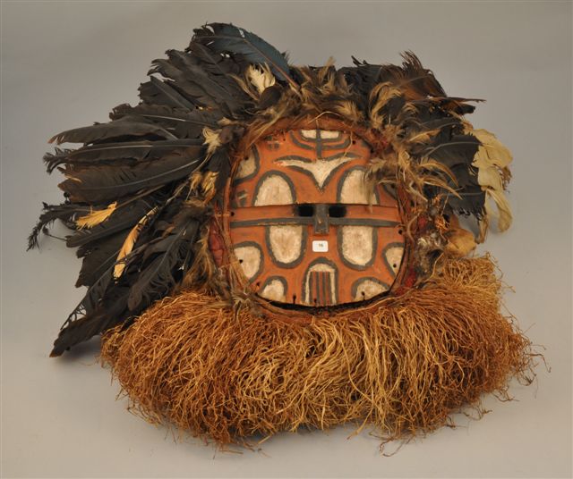 MASQUE LUNAIRE. Bois à décor mosaïqué peint d'argile blanc et rouge, coiffe en plumes et fibre.