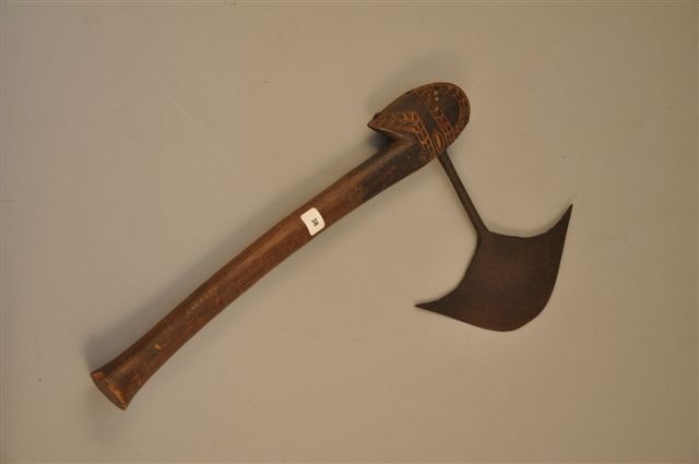 MACHETTE à lame de fer et poignée de bois sculpté d'un animal stylisé.