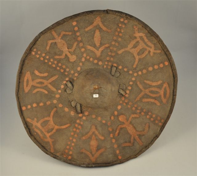 BOUCLIER rond en peau d'hippopotame avec umbo en forme de sein, il est peint d'animaux et de motifs stylisés de couleur rouge, poignée en bois recouvert d'une tresse de peau.
