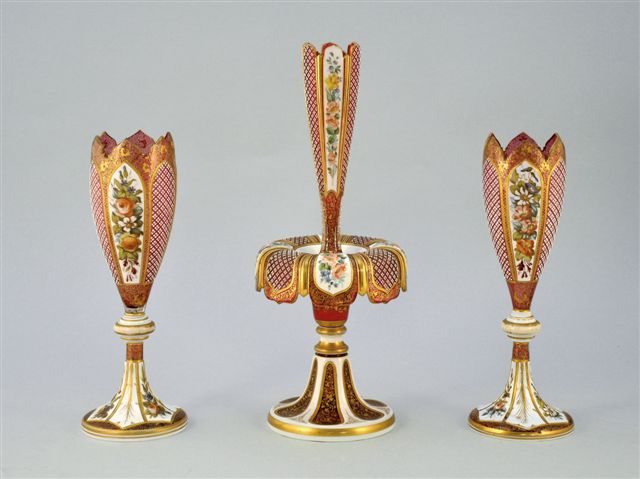 GARNITURE composée de trois pièces en verre parme, polychrome et or, à décor de fleurs champêtres dans des réserves, elle comprend une paire de vases calices sur piédouche et un milieu de table.