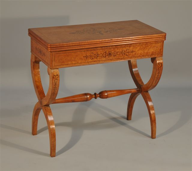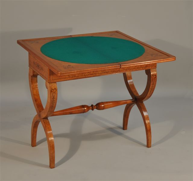 TABLE À JEUX en placage de loupe et incrustations d'amarante, décor de frises, d'entrelacs, de volutes et de fleurs de lotus stylisées. Le plateau tournant à riche décor de volutes et palmettes. Elle repose sur un piètement en X réuni par une entretoise tournée en double poire.