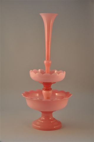 COUPE MONTÉE sur piédouche en verre opalin rose et framboise, deux bassins à bordure dentelée, la partie supérieure se terminant en vase cornet.