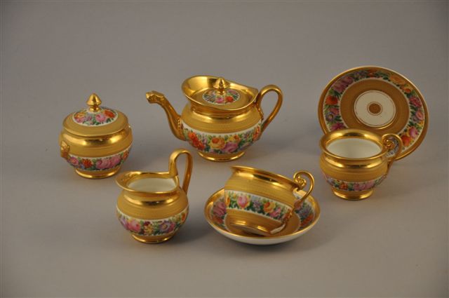 DÉJEUNER en porcelaine blanche rehaussée d'or mat et brillant, encadrant un bandeau de fleurs épanouies. Il comprend une théière, un sucrier, un crémier et une paire de tasses et leurs sous-tasses.