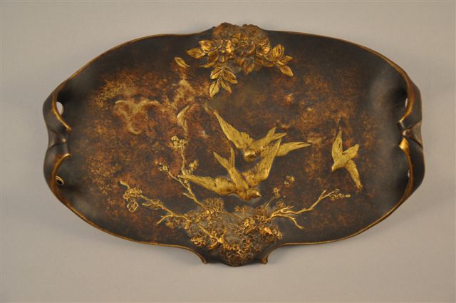 PLATEAU ornemental ovale en bronze patiné à décor en bas relief d'oiseaux en vol et de fleurs, anses latérales relevées.