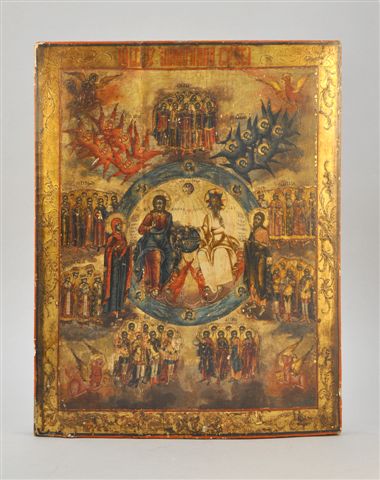 ICÔNE : LA SAINTE-TRINITÉ avec le Père, le Fils et le Saint-Esprit. Tout près Marie mère de Dieu et Saint-Jean. La Trinité est entourée par différentes catégories de Saints. En haut entre les séraphins et les chérubins, on voit des anges menés par l'Archange Saint-Michel. Parmi les autres groupes, on distingue des saints militaires, des saints apôtres, des ecclésiastiques russes. Aux écoinçons, les symboles des quatre évangélistes ou Tétramorphe.