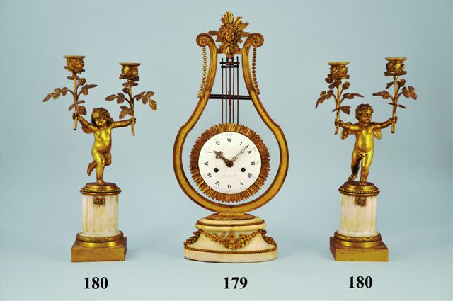 PAIRE de BOUGEOIRS à deux lumières en bronze doré et ciselé figurant un putti sur une colonne en marbre blanc. Les putti, l'un aux ailes de papillon, l'autre aux ailes d'oiseau tiennent deux tiges de roses formant les lumières.