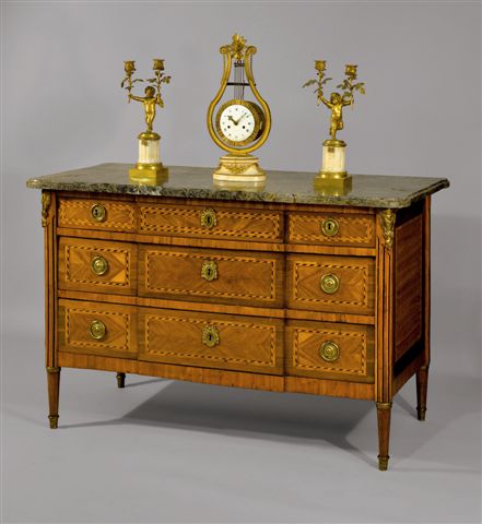 COMMODE en bois de placage et filets de marqueterie. Elle ouvre à trois rangs de tiroirs, dont trois dans le registre supérieur. Montants à cannelures simulées.