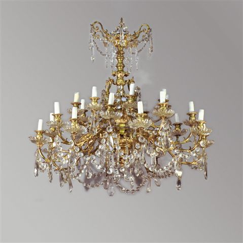 LUSTRE à pendeloques en bronze et laiton doré à vingt-quatre lumières, les bras en volutes feuillagées. Fût de style composite à côtes torses, feuilles d'acanthe, appliqué de volutes. Binet feuillagés et bobèches à raies de coeur. Pendeloques en cristal de style Louis XVI dont guirlandes et poignards.
