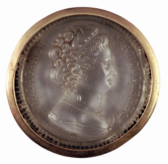 Profil de femme. Inscription circulaire : "A. DE LAGARDE DES HOULIERES".