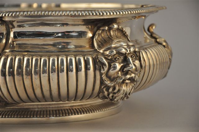 JARDINIÈRE - BASSIN de forme mouvementée en bronze argenté, le pourtour godronné orné de larges feuilles d'acanthes et de deux mascarons sommés de coquilles, reposant sur une plinthe ovale godronnée. Doublure en métal argenté.