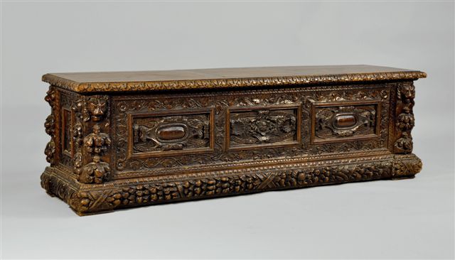 COFFRE en bois naturel richement mouluré et sculpté, au répertoire iconographique de La Renaissance : têtes d'animaux, oves, entrelacs, cuir découpé, guirlandes, fruits.